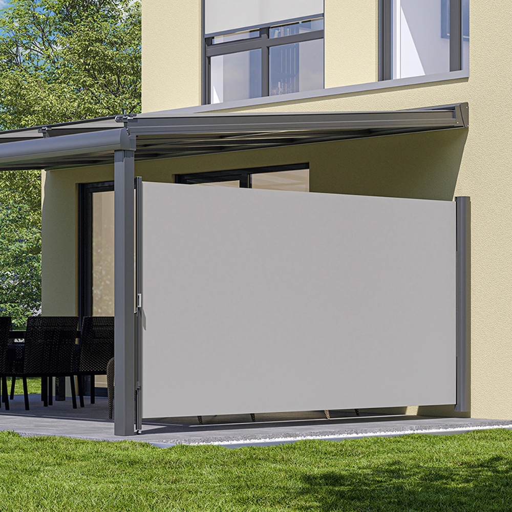 - Typ: Seitenzugmarkise mit Tuchwelle und Handgriff-Bedienung, für flexiblen Sonnen-, Wind- und Sichtschutz