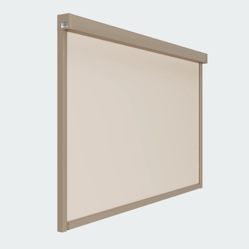- Typ: Senkrechtmarkise mit Zip‑Tuchführung (geschlossene Führung optional) für straffen Tuchsitz und gute Windsicherheit