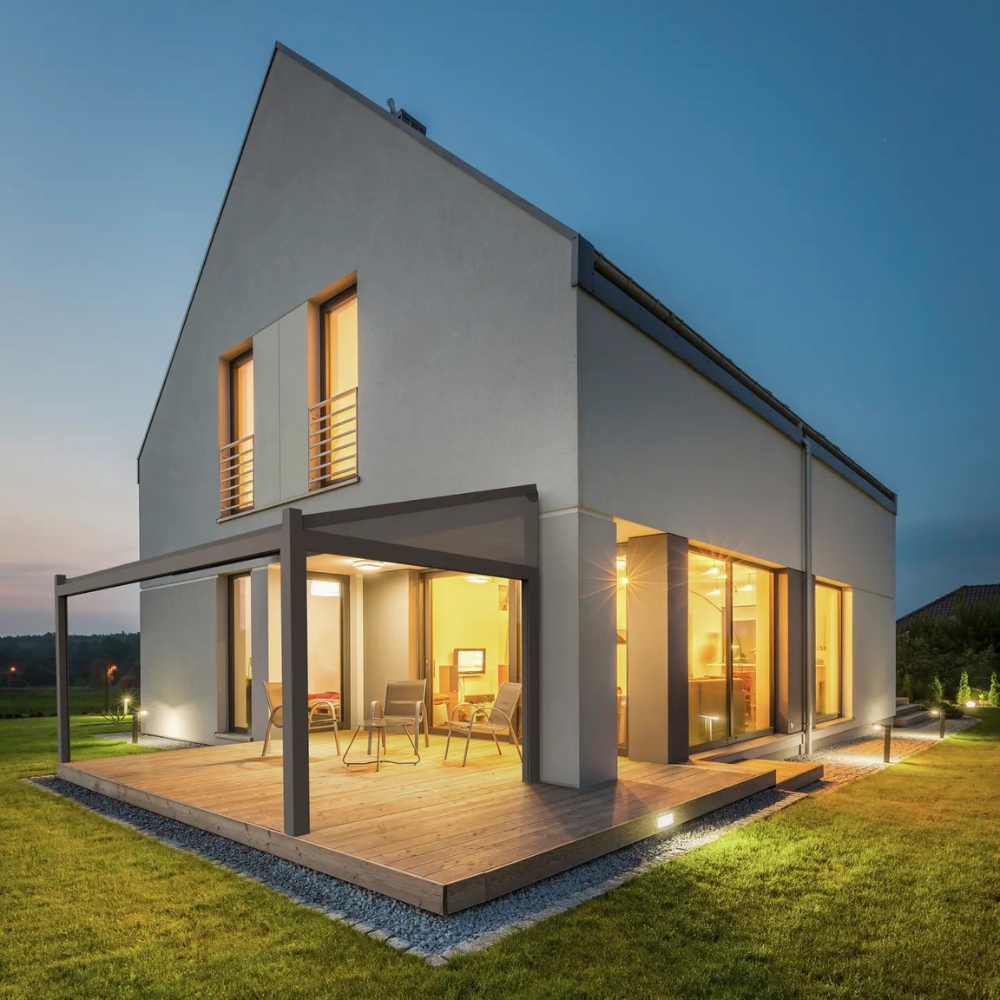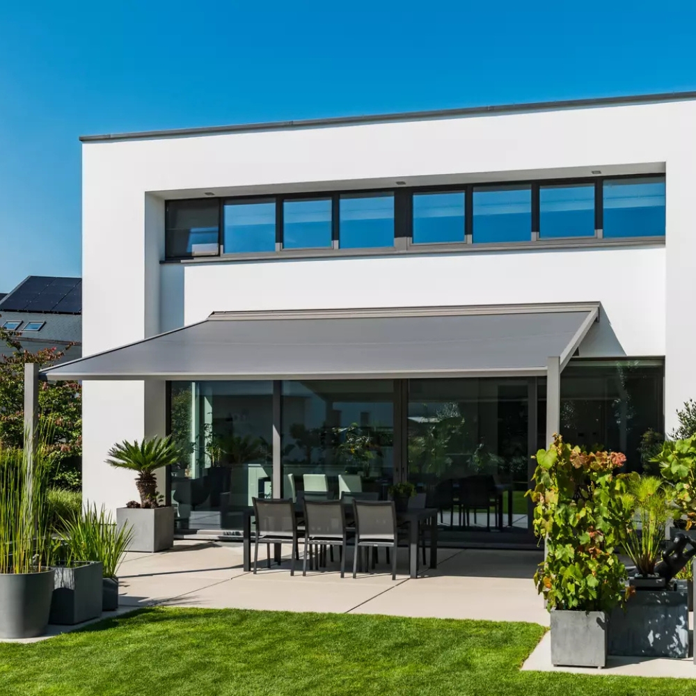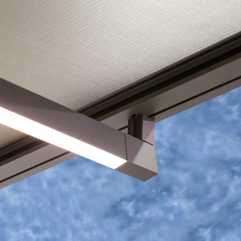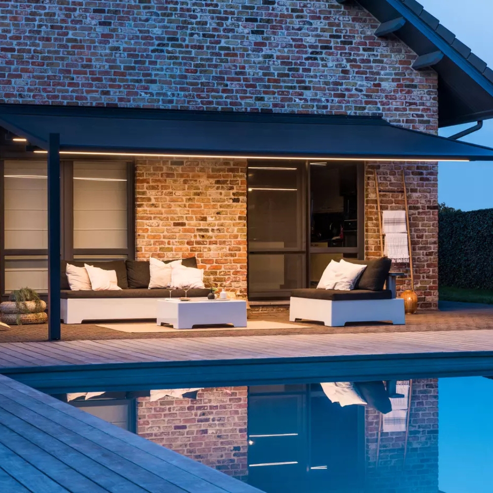 Die Renson Lapure ist eine wandmontierte Terrassenüberdachung mit einziehbarem High‑Tech-Tuchdach, das flexibel vor Sonne und Regen schützt. Das minimalistische Aluminiumprofil passt perfekt zu moderner Architektur und lässt sich elektrisch per App, Handsender oder Smart‑Home-System bedienen. Optional können LED‑Beleuchtung, Wettersensoren und seitliche Screens integriert werden, um individuellen Komfort und stimmungsvolles Outdoor-Living zu ermöglichen.