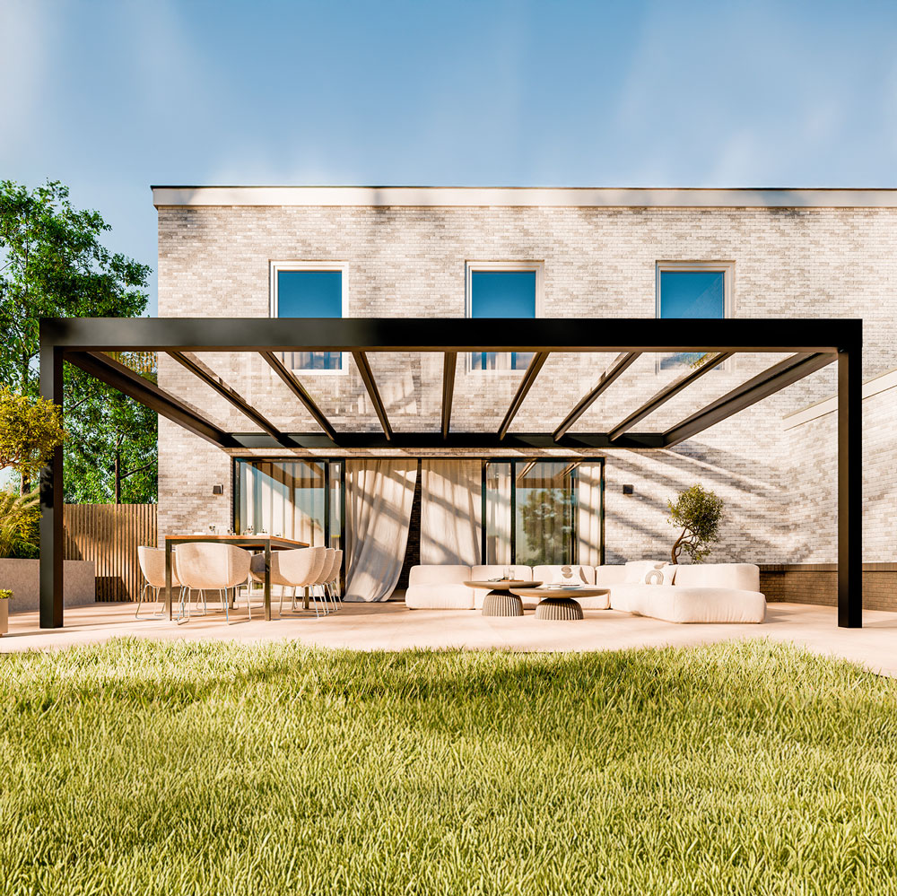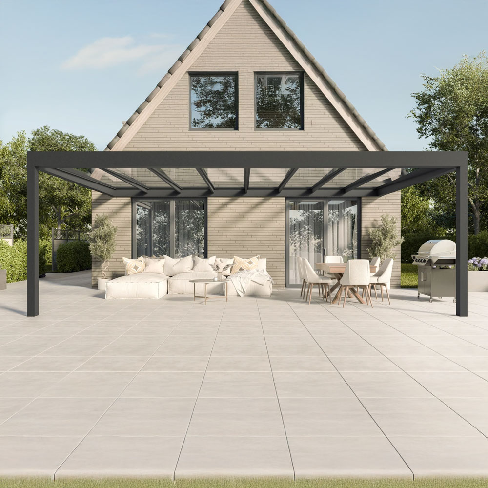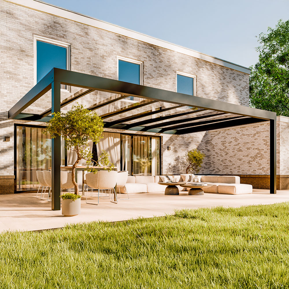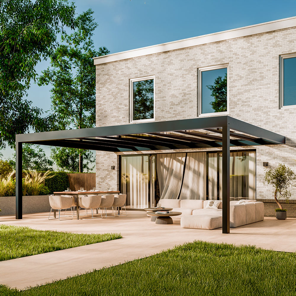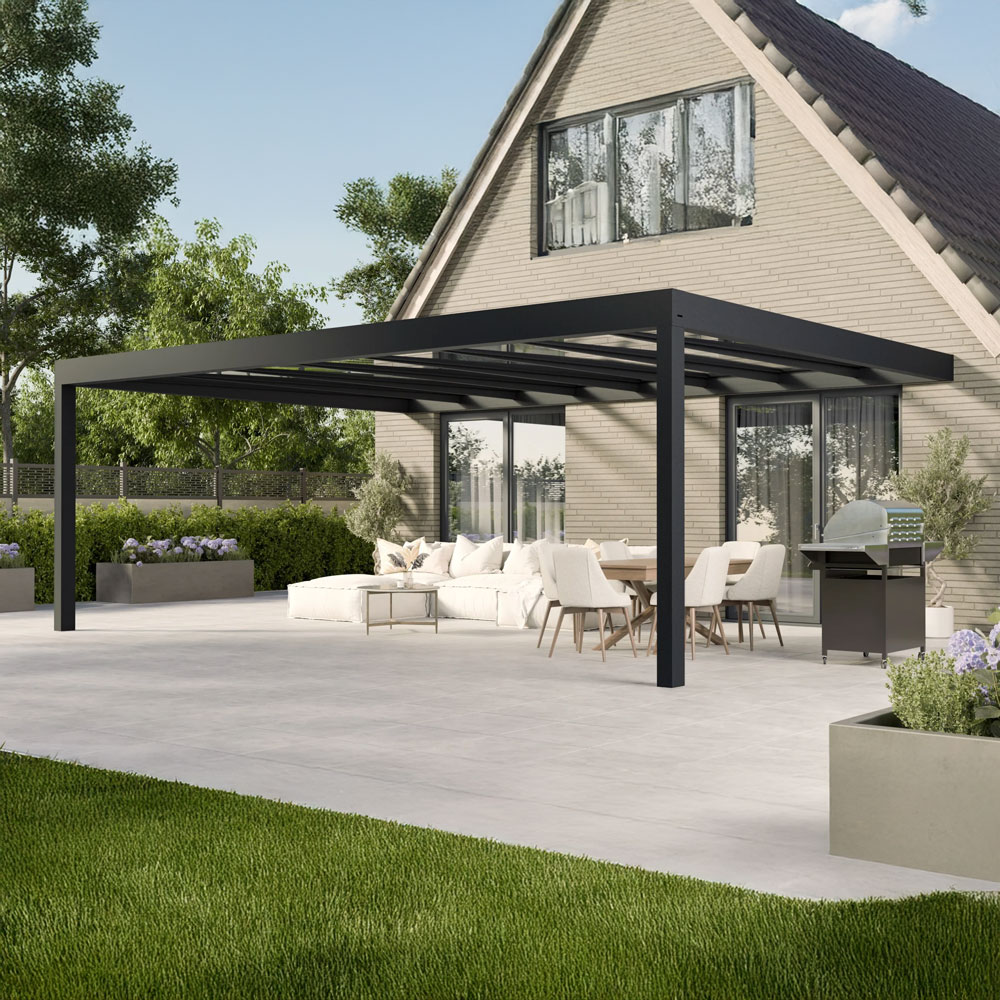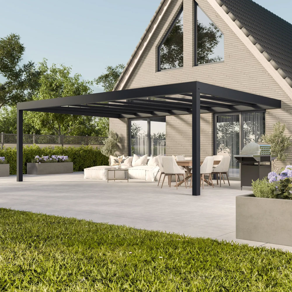 Die Skyline von Aluxe ist eine elegante, minimalistische Terrassenüberdachung – ganz im modernen, kubistischen Stil. Ihr flaches Dach mit klaren Linien wirkt besonders schlank und hochwertig. Sie kann sehr große Flächen überspannen (bis zu 7 m Breite und 5 m Tiefe), selbst bei vier Pfosten, was für eine stabile, aber offene Konstruktion sorgt.