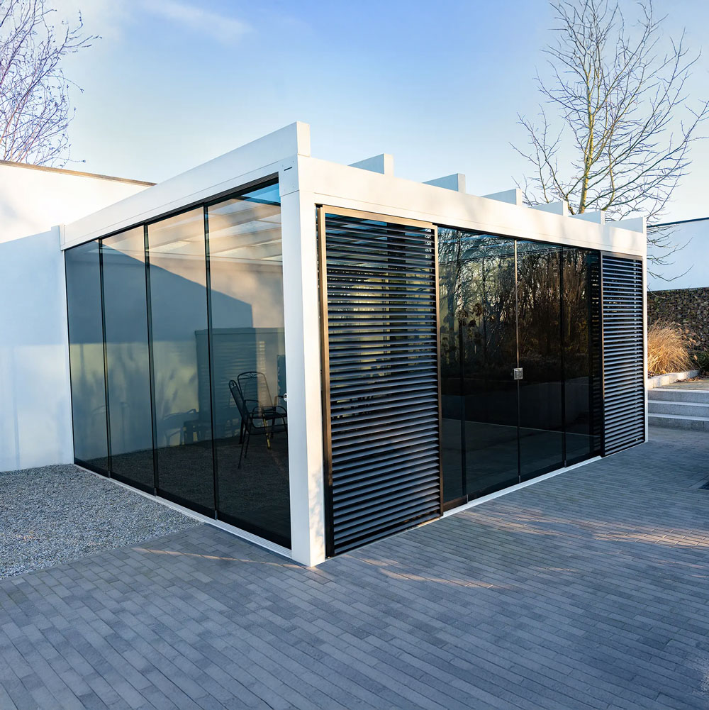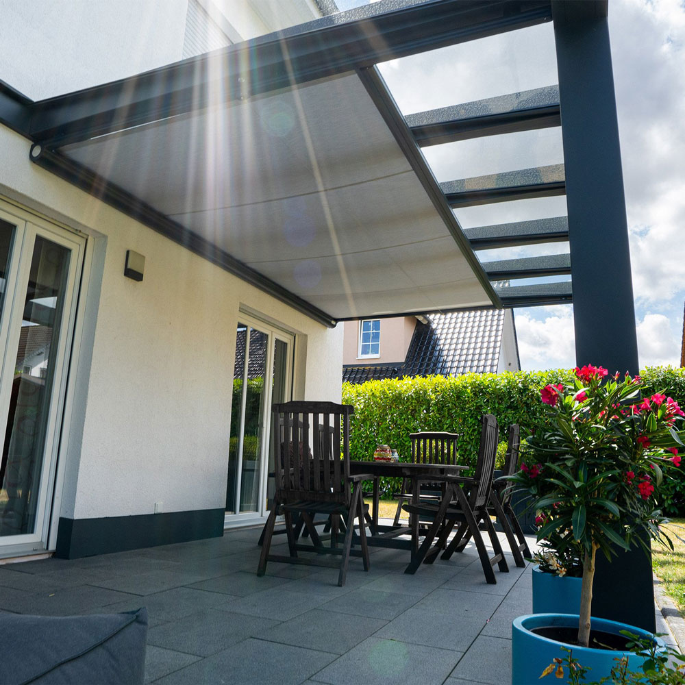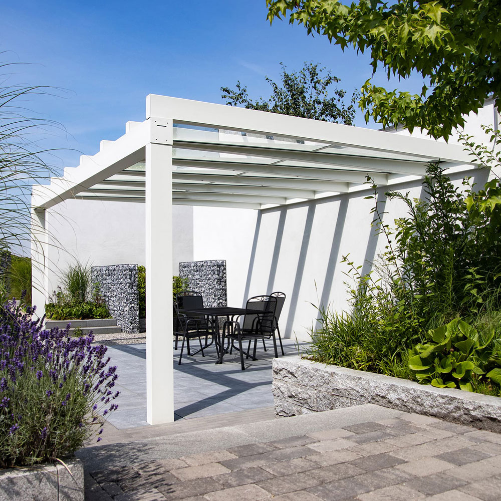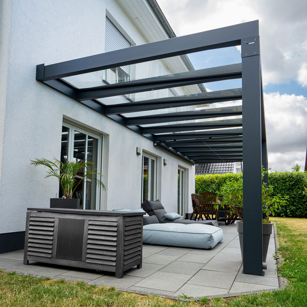Die Ultraline Compact von Aluxe ist eine sehr puristische Terrassenüberdachung im kubischen Flachdachstil – ganz ohne sichtbaren Dachüberstand oder Frontleiste, was ihr ein klar-minimales Erscheinungsbild verleiht. Trotz der schlanken Optik ist sie statisch stark: Auf nur zwei Stützen kann sie bis zu 7 00 cm Breite und 5 00 cm Tiefe realisiert werden.