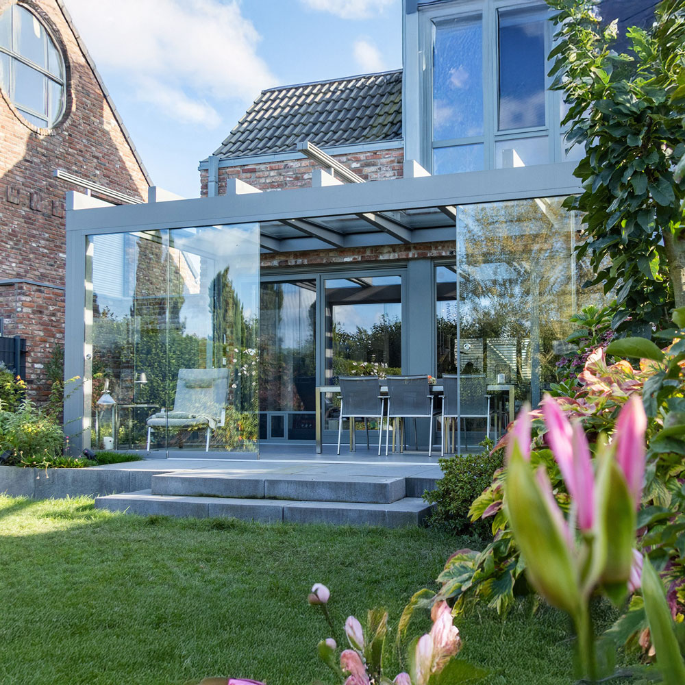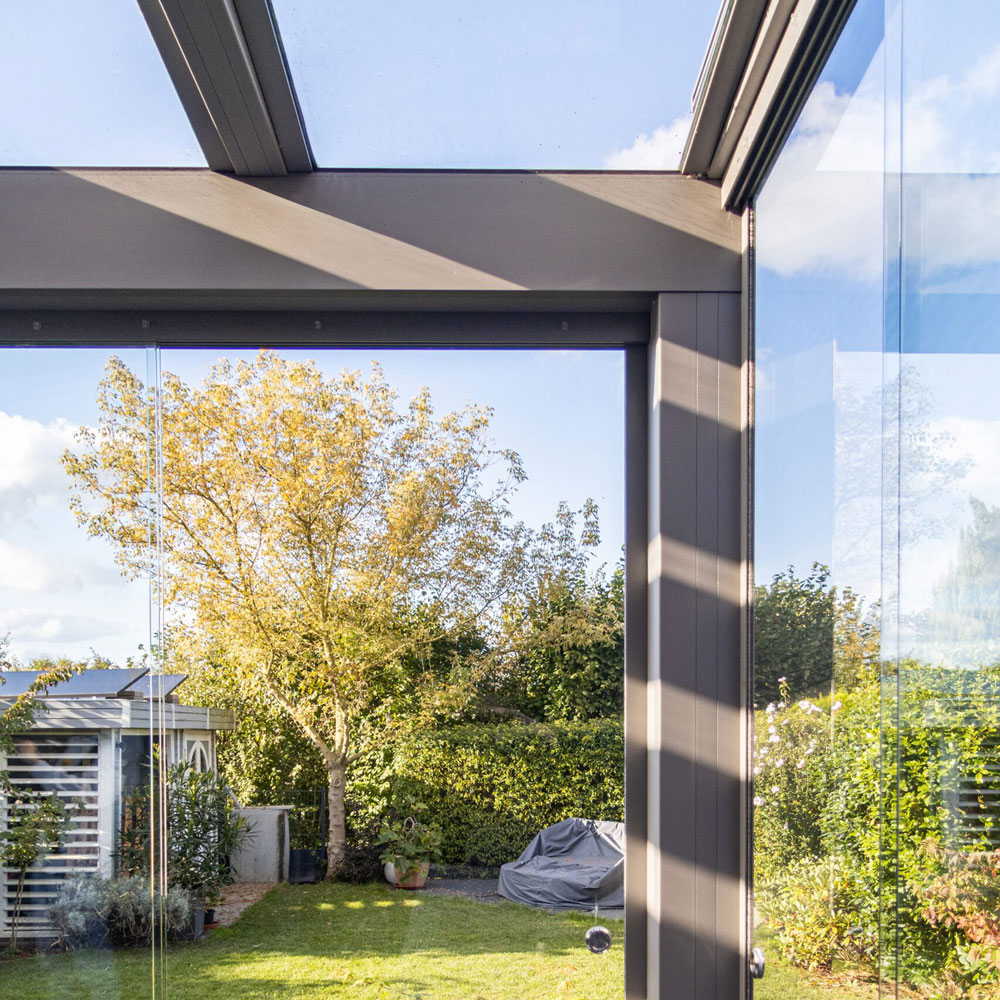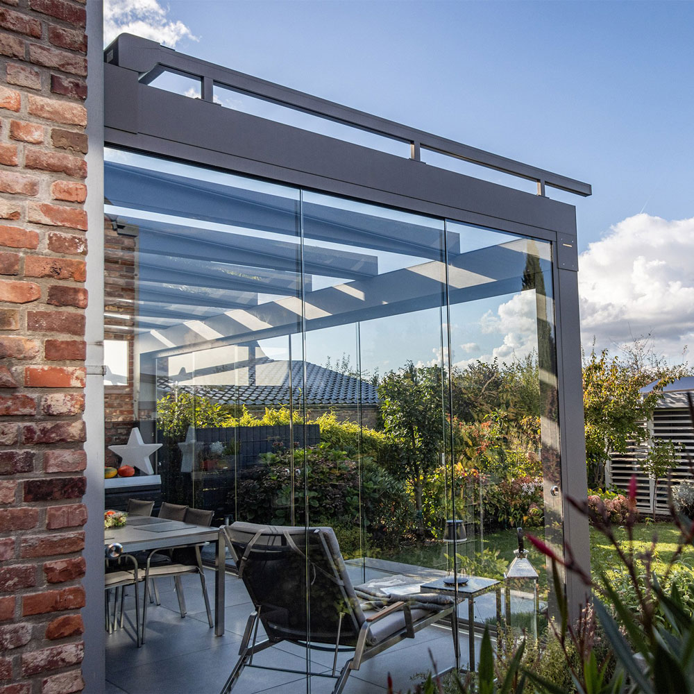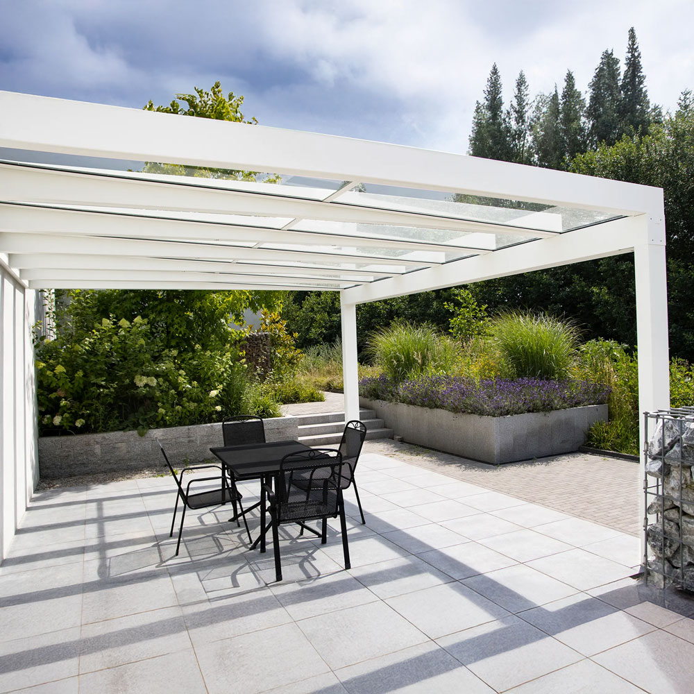 Die Ultraline Compact von Aluxe ist eine sehr puristische Terrassenüberdachung im kubischen Flachdachstil – ganz ohne sichtbaren Dachüberstand oder Frontleiste, was ihr ein klar-minimales Erscheinungsbild verleiht. Trotz der schlanken Optik ist sie statisch stark: Auf nur zwei Stützen kann sie bis zu 7 00 cm Breite und 5 00 cm Tiefe realisiert werden.