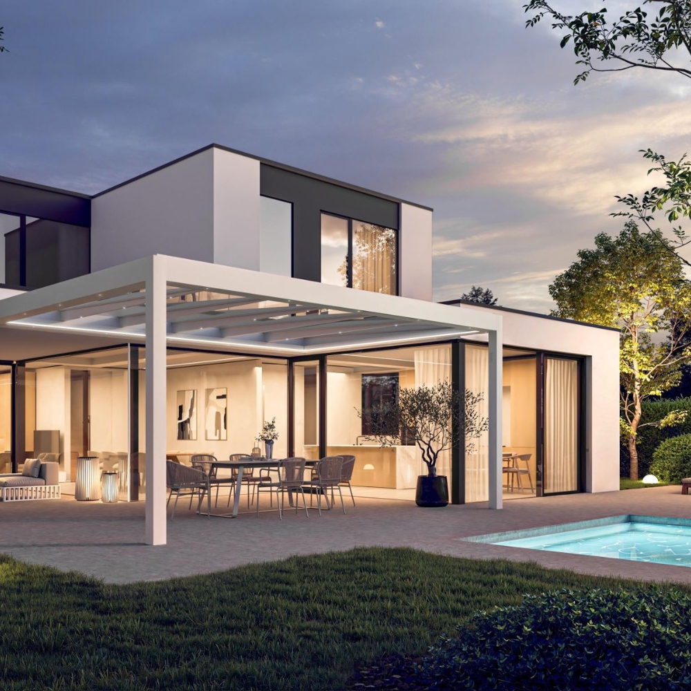 Dach- / Ausstattungsoptionen Laminierte Sicherheitsglasscheiben; integriertes Wasserableitungssystem; optional LED, Heizstrahler, Steckdosen, Lautsprecher, Glasschiebewände
